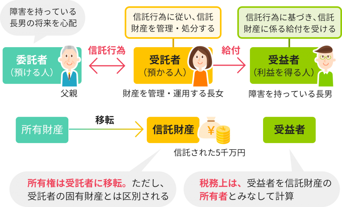 障害を持っている長男の将来を心配した父親が、自分の財産の中から5千万円を長女に託し、「私にもしものことがあったときはお前が兄ちゃんのためにこの財産を管理・運用して、兄ちゃんの生活を支えてやってほしい。」と依頼したとします。これが家族信託の典型的な例です。この場合、父親を委託者、長女を受託者、長男を受益者といい、信託された5千万円を信託財産と呼びます。